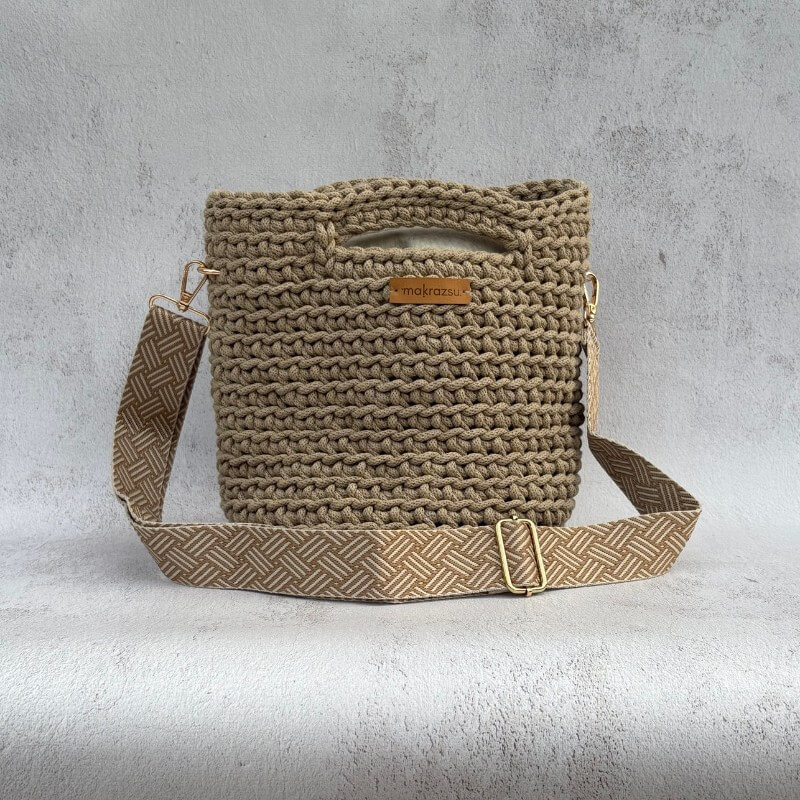 Anyag: a táska anyaga 100% újrahasznosított 5 mm vastag homok színű pamut zsinórfonal, a bélés 1 mm vastag drapp színű polyfilc. Az oldalpánt szélessége 4 cm, hossza kb. 120 cm.